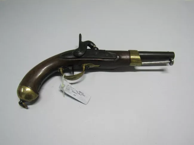 Pistola de percusión, con cañón redondo pavonado y baqueta. Presenta b...