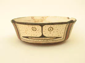 Pequeño recipiente cerámico de base apuntada, cuerpo globular y boca restringida. Dos protuberancias opuestas casi en el borde. Superficie alisada y engobada sin decoración