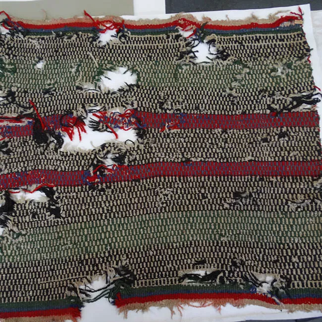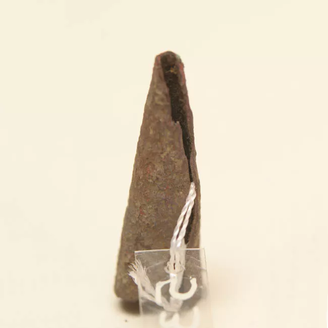 Objeto utilizado en la cabeza de los hombres al ir a cazar, creyendo que le otorgaría un poder especial en esta labor a quien lo portara. El tocado tiene forma triangular, redondeado en su ángulo superior. Está confeccionado con un trozo de cuero descarnado de guanaco, al cual se le agrega usualmente un cordón de tendón, para sujetarlo en la cabeza, pero que no se encuentra. Está decorado con pintura de color rojo en su cara frontal. Tiene inscrito el número: “14272” y "ONA" con pintura color blanco, “M.H.” y "2018.3.1070" en tinta de color negro.