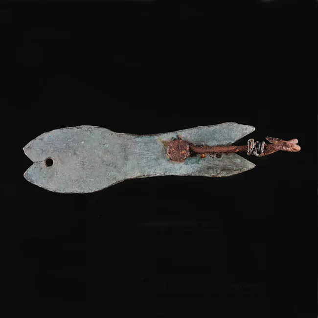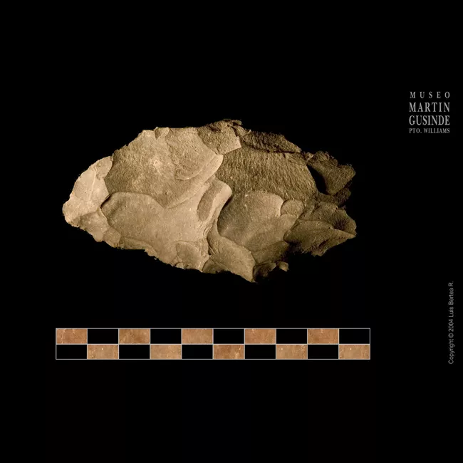 Objeto metálico de cuerpo oblongo. Su extremo superior es de perímetro rectangular, mientras que el extremo distal opuesto es de aspecto abanicado con su borde semi curvo y con sus cantos agudizados a fin de formar un borde afilado apto para el corte.