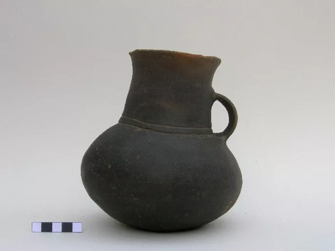Vasija pulida, simétrica, restringida con cuello, compuesta con un asa...