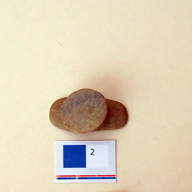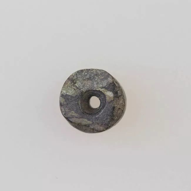 Adorno formado por 224 pequeñas cuentas discoidales de color gris en diferentes tonalidades. Esta pieza fue armada con cuentas provenientes de diferentes unidades del sitio La Granja, durante el montaje de la Sala Historia Regional 1