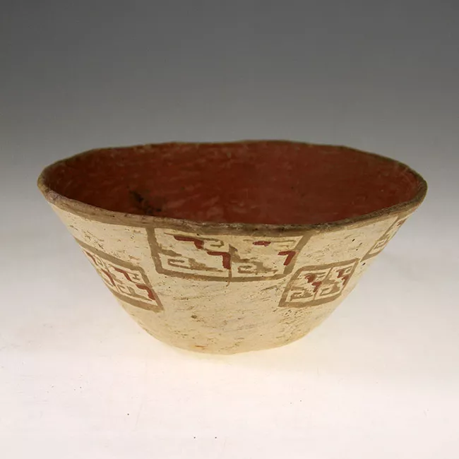 Vasija simétrica de estructuras no restringida y de perfil simple. El cuerpo es de forma subovoidal y de borde recto; el labio es plano y la base plana. La superficie color de la pasta (rojizo) en el exterior y tiene engobe blanco en el interior. La superficie exterior está decorada con trazos lineales blancos en el borde formando romboides unidos por el vértice; mientras que la superficie interior está decorada con líneas rojas sobrepuestas formando ángulos rectos, y triángulos opuestos pintados de rojo. Pieza fragmentada e incompleta
