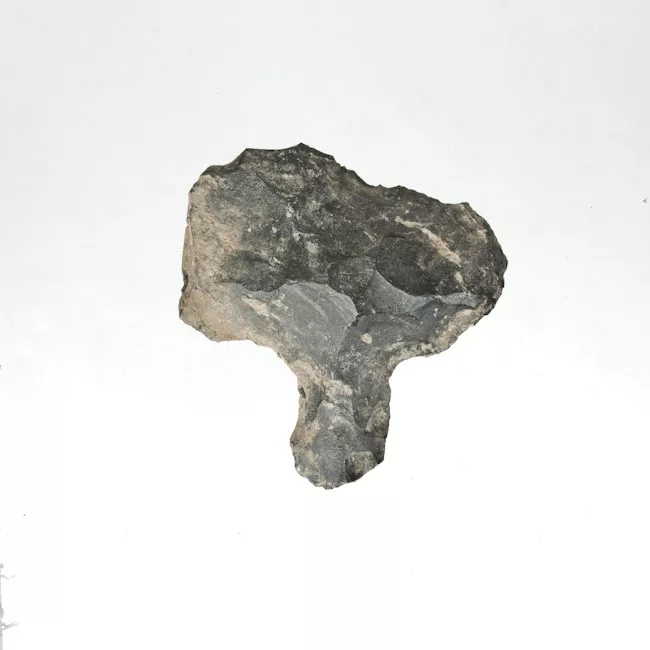 Pieza completa de forma triangular y de color negro, variedad traslúcida. Ambas caras están talladas y los bordes muestran evidencia de retoque bimarginal. La base es apedunculada y recta. En una de sus caras hay restos de pegamento blanco.