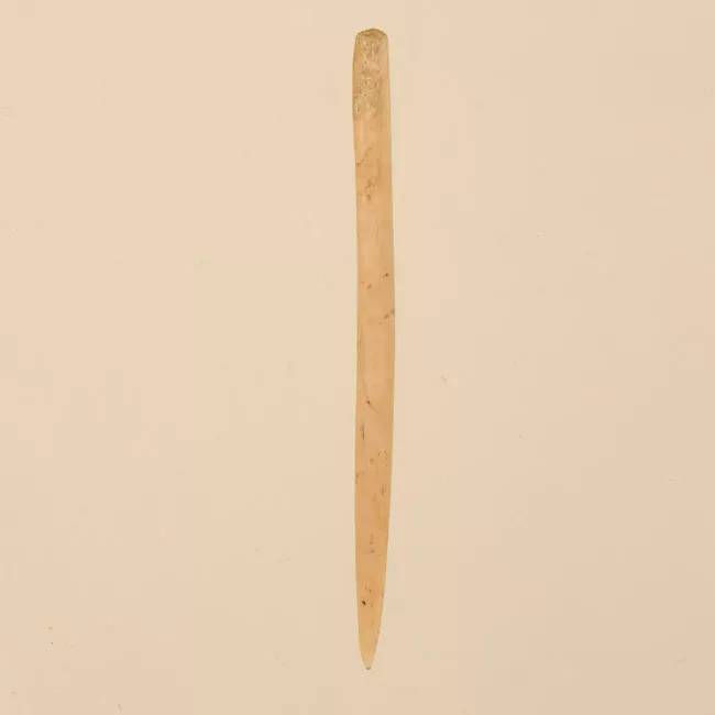 Objeto de hueso de forma rectangular. Sus lados largos convergen en un...