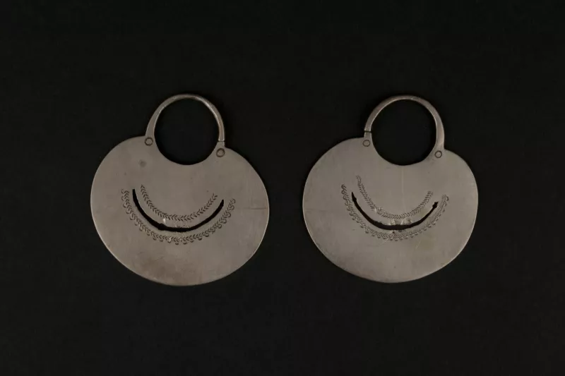 Pieza completa, de color negro con una cubierta de óxido verde y de forma circular. El anverso es convexo y tiene un reborde perimetral y decoración sobre relieve formando una cinta que termina en volutas en ambos extremos, y al centro el número 3. El borde es angosto, recto y liso; el reverso es cóncavo y liso y al centro tiene un alambre en arco que forma el agujero de sujeción. Se conservan restos de textil en el reverso