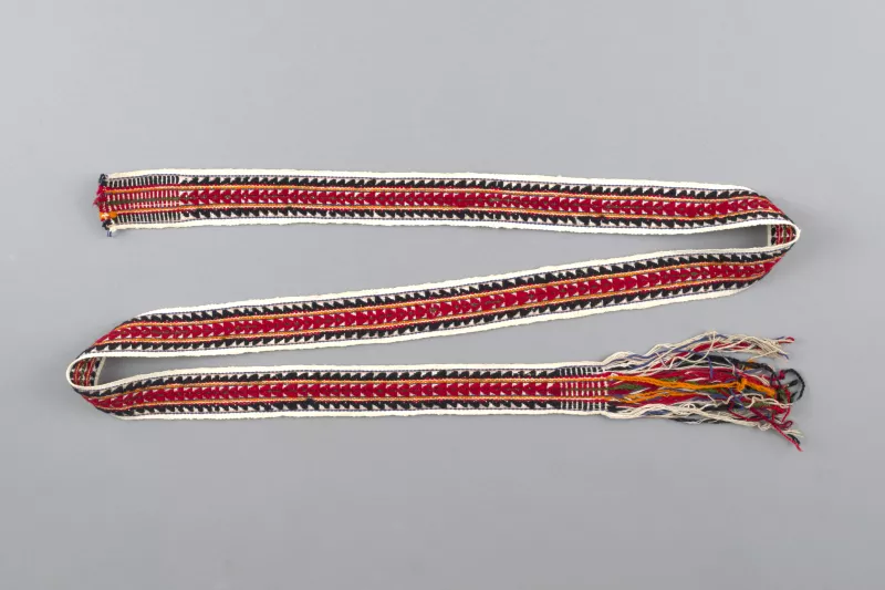 Faja larga y angosta tejida en técnica de faz de urdimbre con diseño...
