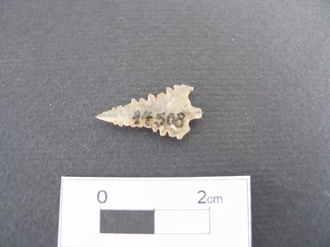 Punta triangular con aletas y pedúnculo. Borde dentado. Talla bifacial...