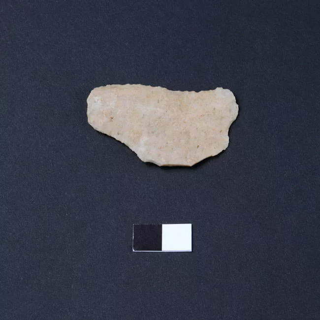 Herramienta de molienda usada en conjunto con la mano de moler. Objeto de forma cuadrangular irregular de base plana y superficie cóncava, fabricado en piedra tallada y pulida de color gris.