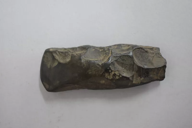 Instrumento lítico de forma semi circular, con bordes irregulares y un...