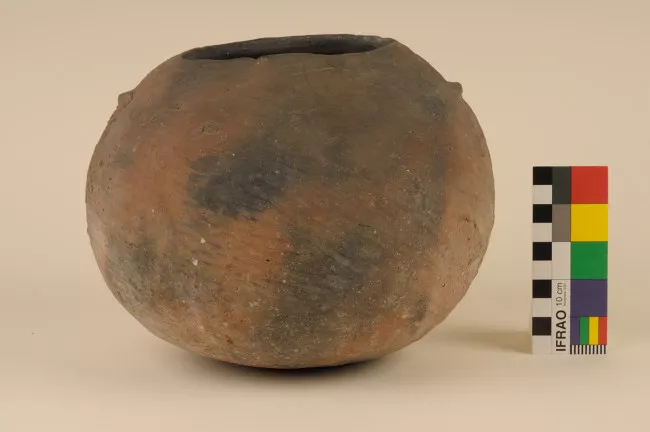 Contenedor restringido de cuerpo globular, base plano cóncava, con dos...