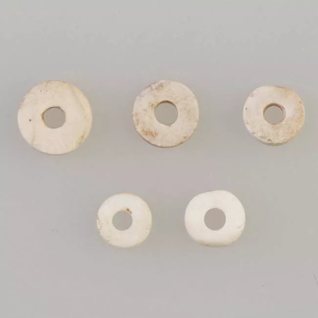Adorno de uso personal que se lleva pediente del lóbulo de la oreja. Objeto fabricado en una lámina metálica curvada con un extremo en forma de estrella de cuatro puntas rematadas tres de ellas en voluta, y adornado con una cuenta cilíndrica de color blanco con perforación central.
