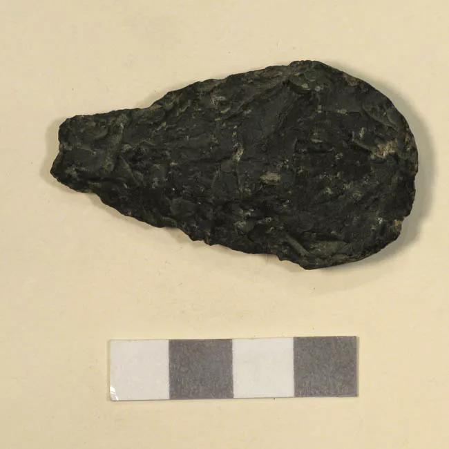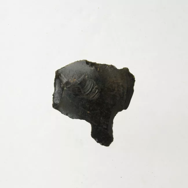 Punta de proyectil de forma triangular. La base de la punta es ligeramente cóncava y presenta unas pequeñas aletas, además de un pedúnculo en su sector central.