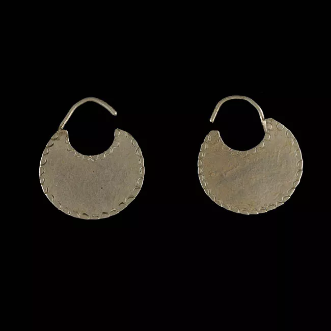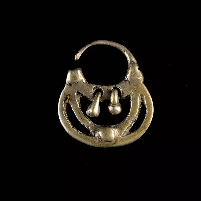 Adorno que se usa como pendiente en joyería, especialmente en el punzón y trapelakucha.Objeto de forma irregular que representa una figura antropomorfa femenina estilizada con un sector superior semicurcular perforado, cabeza con detalle de ojos y nariz en relieve, brazos extendidos y doblados a la altura del codo y pies separados. Lleva falda y detalles de vestimenta especialmente en las mangas. Color plateado brillante.