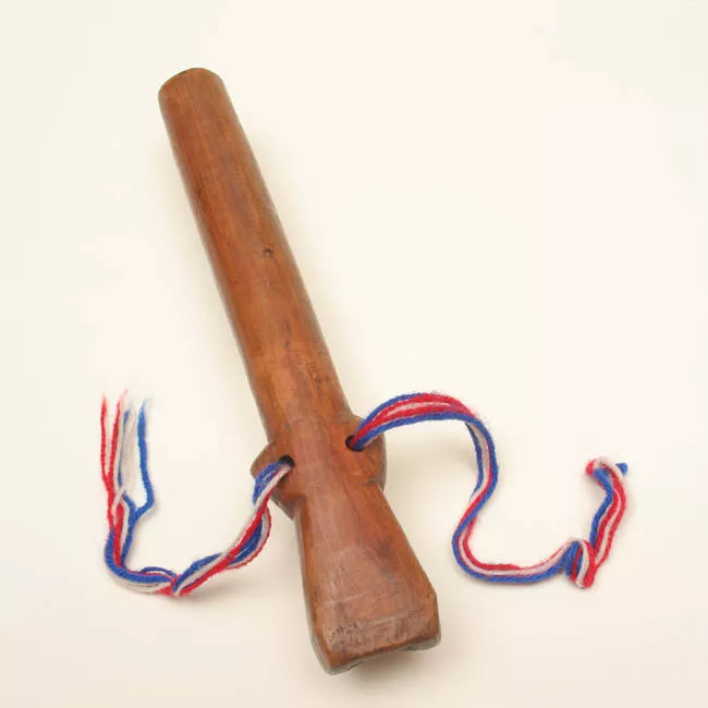 Objeto de uso ceremonial. Idiófono de forma irregular compuesto por una manija curva embarrilada con cuero y fibra de colores marrón y rojo, de la cual penden siete cascabeles perforados de diferentes tamaños. El cuerpo de los cascabeles posee decoración lineal zigomorfa en el hemisferio inferior.
