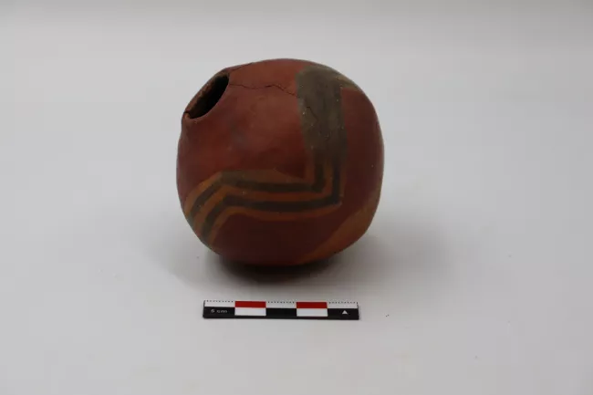 Objeto de uso ceremonial. Contenedor de cuerpo globular. Cuello cilíndrico de labio redondeado y boca restringida con vertedero apuntado. Lleva un asa cinta entre el labio y el cuerpo. Superficie de color café alisada sin decoración.