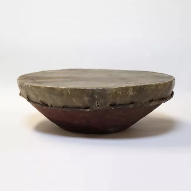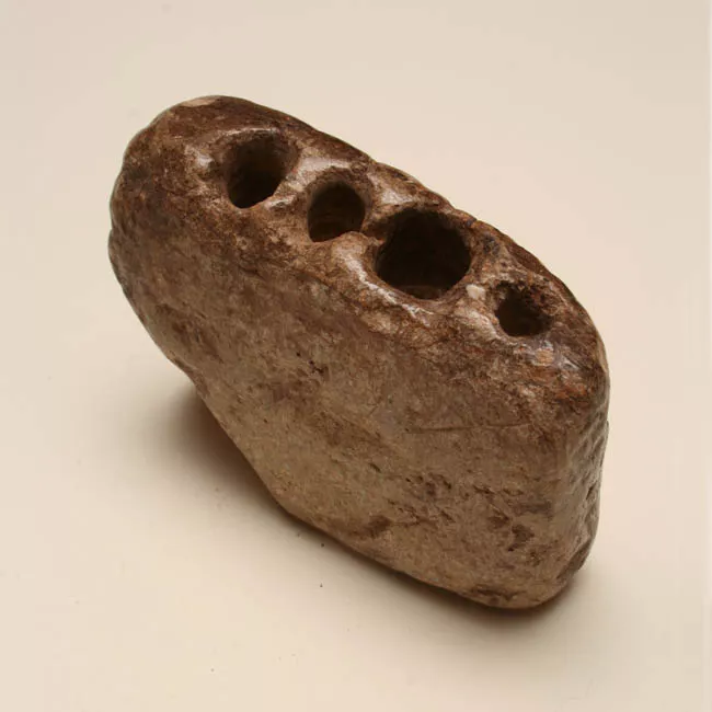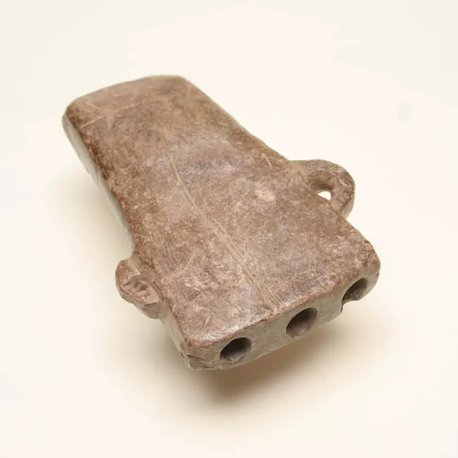 Instrumento sonoro de viento. Elaborado en piedra tallada de forma trapezoidal. En la parte superior cuatro orificios. Asas cinta opuestas en los costados. Una de ellas incompleta. Superficie color café lisa sin decoración.