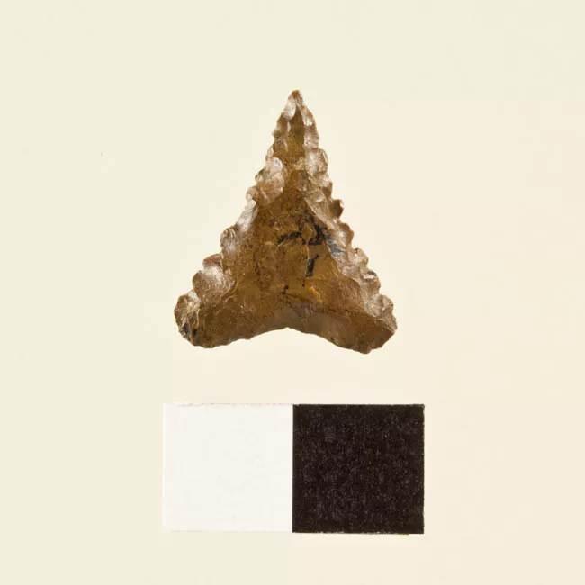 Pieza lítica de forma triangular puntiaguda, bordes dentados, con pedú...