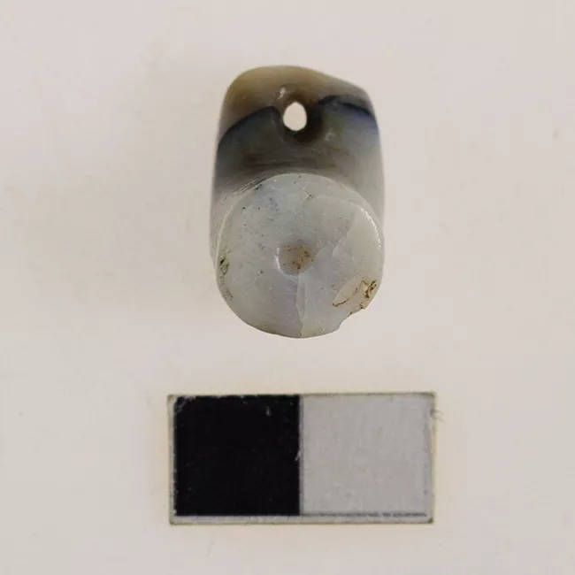 Fragmento de aguja de hueso correspondiente al extremo por donde se pasa el hilo. El extremo de la pieza cercano a la perforación es redondeado. El extremo contrario se encuentra fracturado.