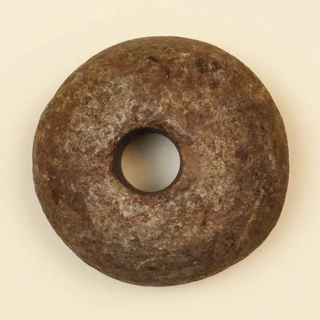 Instrumento lítico de forma esférica, con bordes redondeados y una per...