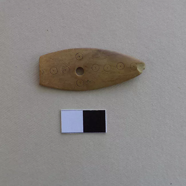 Objeto de forma lanceolada con base fragmentada. Talla bifacial contin...