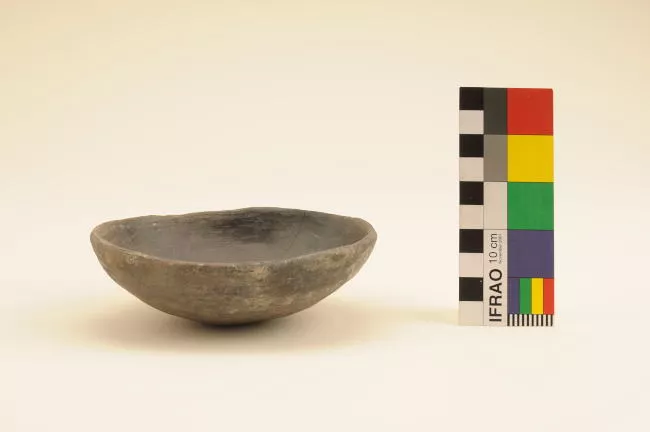 Contenedor cerámico semi esférico apodo. Superficie negra alisada sin ...