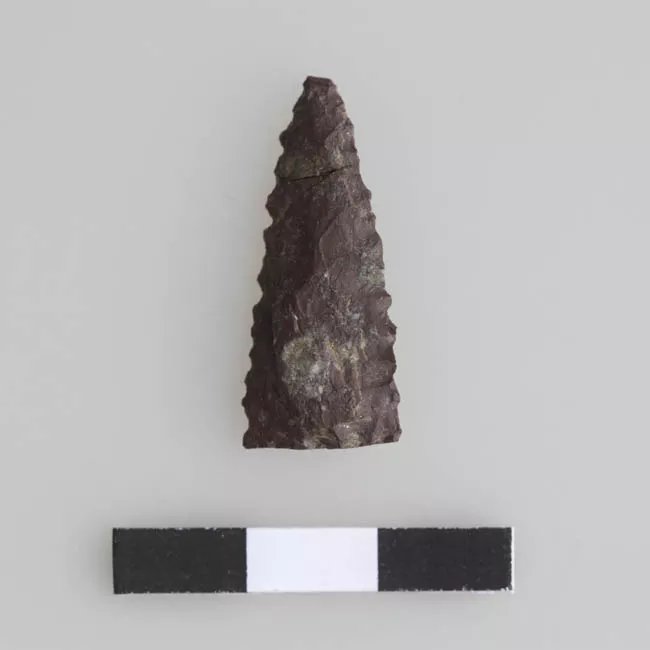 Instrumento lítico compuesto por una semicircular irregular y un vástago rectangular de extremo recto. Se encuentra elaborado en piedra tallada bifacialmente de color negro y marrón.
