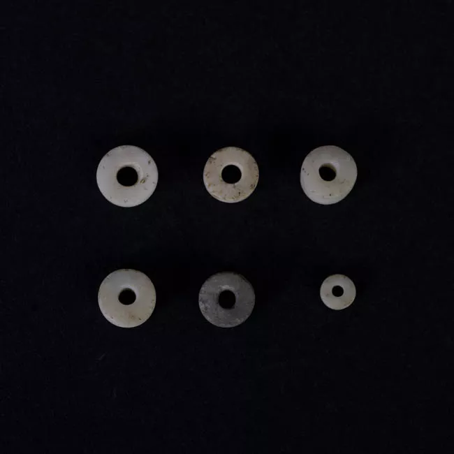 Conjunto de cuentas que conforman un collar. Tienen forma discoidal con bordes generalmente rectos y perforación en el sector central. Está elaboradas en crisocola y turquesa de color verde y verde azulado. Piedra tallada, pulida y perforada.