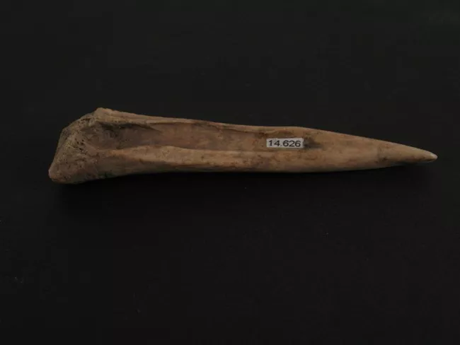 Instrumento lítico expeditivo. Tiene forma poligonal irregular con bordes activos. Está elaborado en piedra tallada bifaciamente de color gris oscuro.