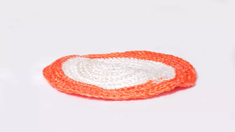 Pieza de forma rectangular tejida con un cabo o hebra torcida (huiñi) de lana de oveja color blanco natural, tanto en la urdimbre como en la trama. Contiene cuatro figuras compuestas que representan flores para las que se utilizó lana de oveja teñida con tinta o anilina color rojo, naranjo, rosado y verde.
