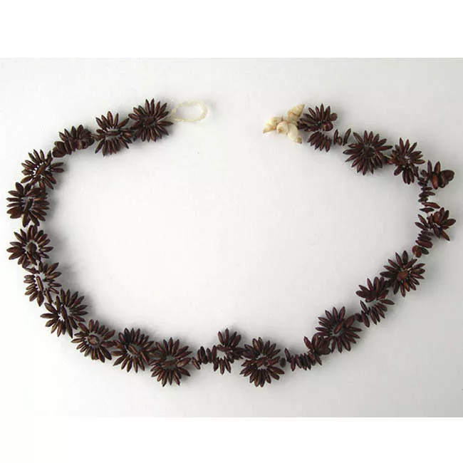 Adorno que se usa rodeando el cuello. Sarta de semillas color café, un...