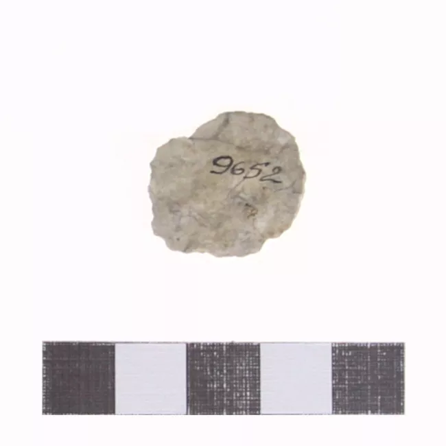 Forma ovoidal. Color naranja. Bordes curvos. Base recta. Una cara plana, la otra convexa con un rebaje o adelgazamiento cerca de la base. Lascado monofacial y retoque bimarginal doble. Corte elipsoidal. Punta de proyectil usada para actividades de caza.