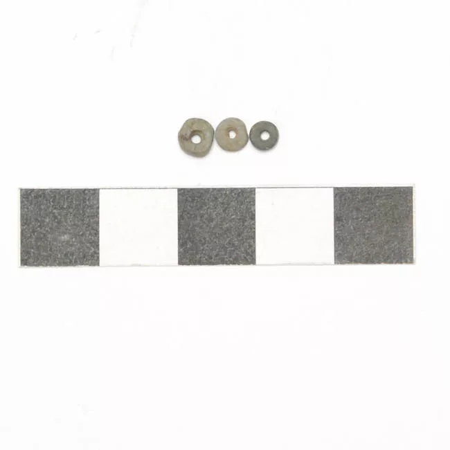 Fragmento de la concha de ostión con forma irregular, presenta una perforación circular pequeña cerca del borde dode tambien hay una perforación semi circular. Bordes alisados.