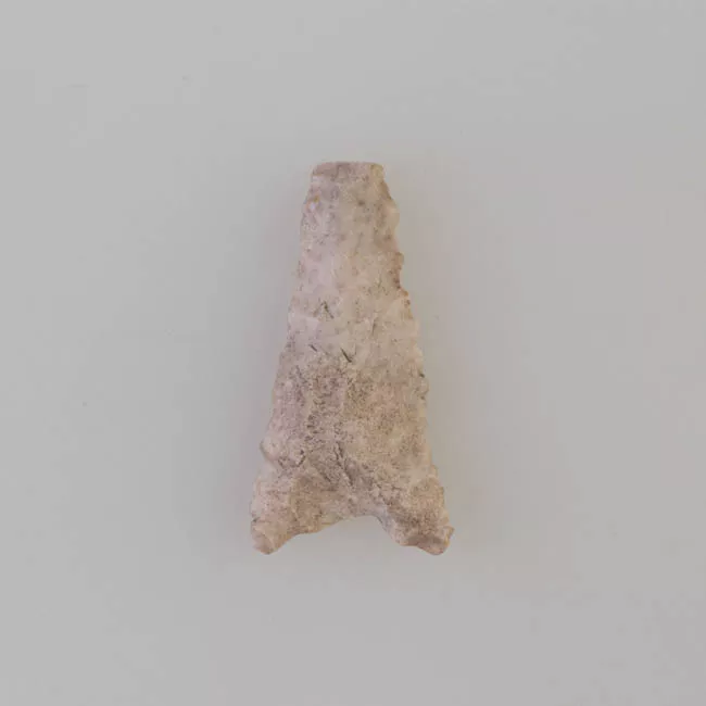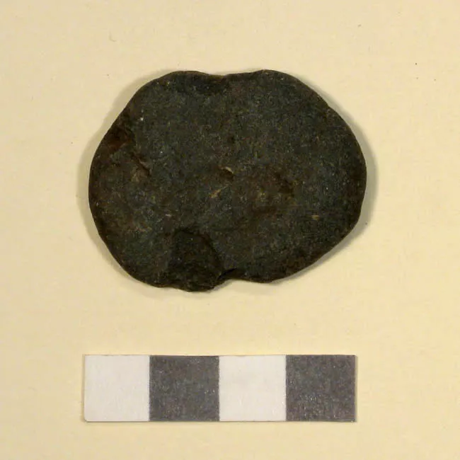 Entera, una cara manchada con ocre. De forma elipsoidal. Ambos extremo...