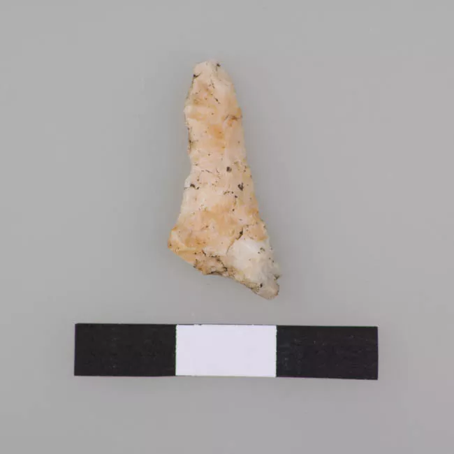 Forma elipsoidal, quebrada. Faltan ambos extremos. Bordes rectos. Caras convexas. Color Amarillo- anaranjado. Retoque bifacial y bimarginal doble. Corte transversal ovoidal. Punta de proyectil usada para actividades de caza.