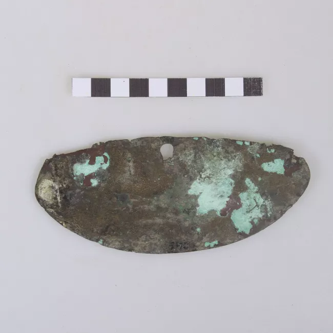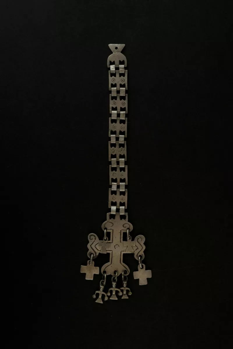 Fragmento textil, confeccionado en ligamento tela y tapicería ranurada, dividido iconograficamente en tres zonas: Zona superior con fondo beige y diseño de planos escalonados color amarillo con figuras ornitomorfas en amarillo, café y azul; una zona central compuesta por una franja color amarillo con figuras ornitomorfas (más complejas que las anteriores) en color naranja, azul, café y blanco y delineadas en negro, separada de la zona superior e inferior por una delgada franja salmón con rombos negros; y una zona inferior de flecos tejidos color amarillo.