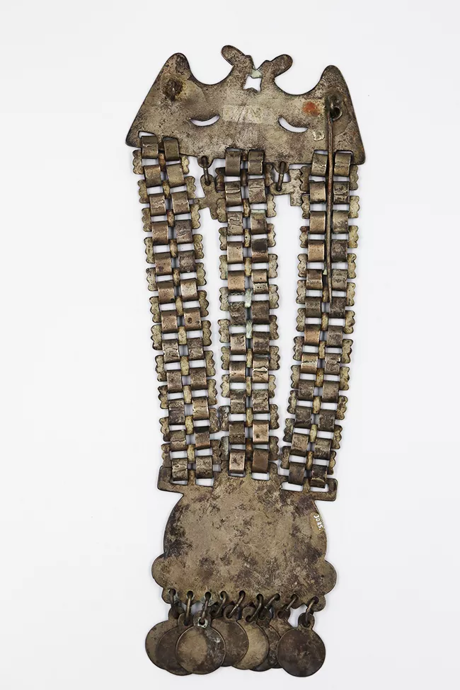 Colgante pectoral de uso femenino, se compone de una cadena y placa cruciforme de la penden diversas figuras. Al extremo superior presenta un broche circular, con relieve abultado y estriado; luego eslabones anchos unidos a la placa inferior en forma de cruz, con extremos recortados en formas curva, de esta penden dos colgantes antropomorfos y dos cruciformes. Presenta orientación en relieve, líneas y formas curvas ubicadas sobre la placa cruciforme.
