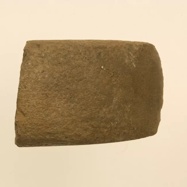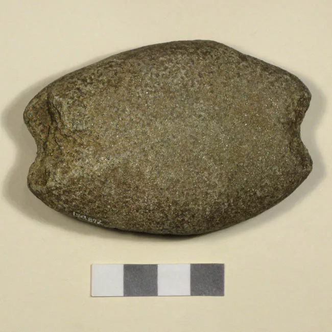 Objeto utilizado para la caza. Piedra tallada de forma oblonga. Un ext...
