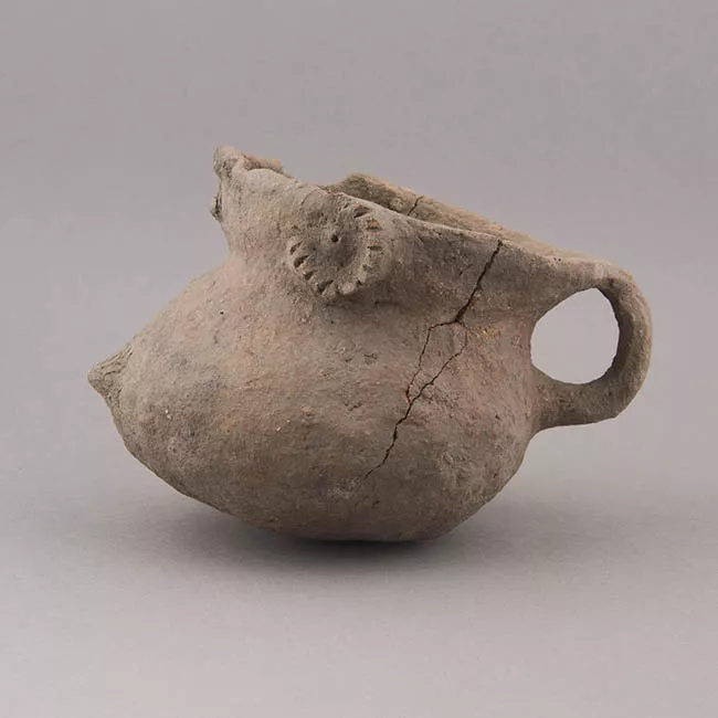 Objeto de forma ovalada, de talla bifacial con retoque bimarginal; base curva y punta ligeramente fragmentada. Color gris claro.