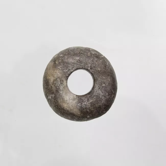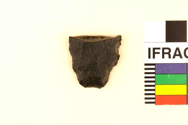 Fragmento lítico triangular gris oscuro con sectores blanquecinos. Car...