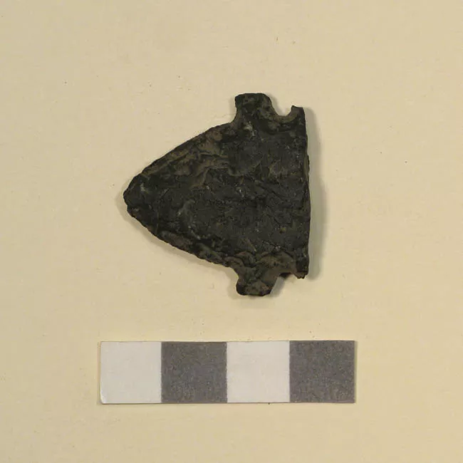 Instrumento lítico usado como cabeza de proyectil arrojadizo durante la caza. Objeto de forma ovoidal con base escotada. Tiene talla bifacial tosca. Piedra de color beige.