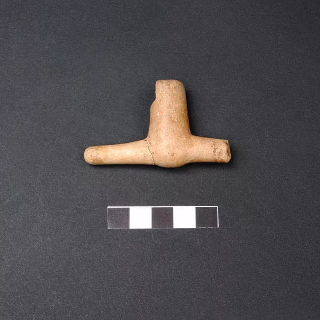 Contenedor de forma compuesta y restringida, con labio evertido, cuello troncocónico invertido, cuerpo globular y base apuntada. Superficie bruñida de color negro y gris con decoración lineal incisa en toda su superficie en patrones finos inclinados y zig-zag.