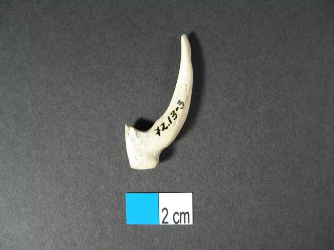 Objeto lítico, con forma lanceolada de base recta, de color beige mote...