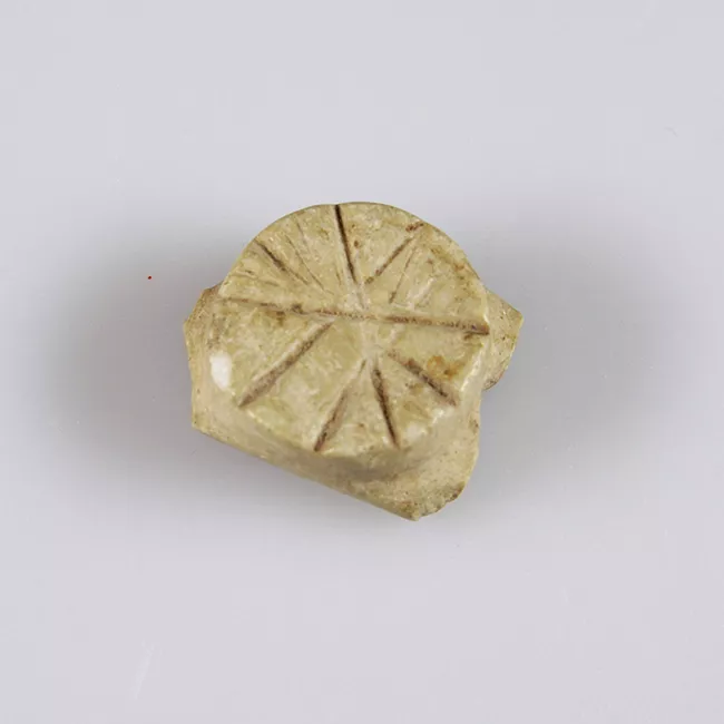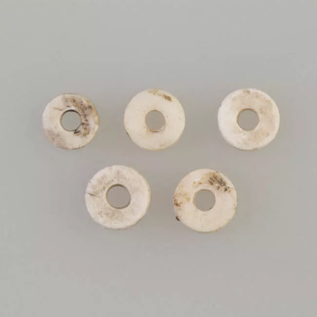 disco de forma circular aplanado. Presenta cinco agujeros posicionados con uno central y los otros cuadros dispuestos de manera simétrica. Pieza color café.