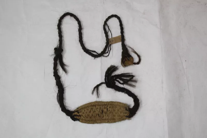 Objeto de lana con cuerpo de forma ovalada de color beige, tiene unido...