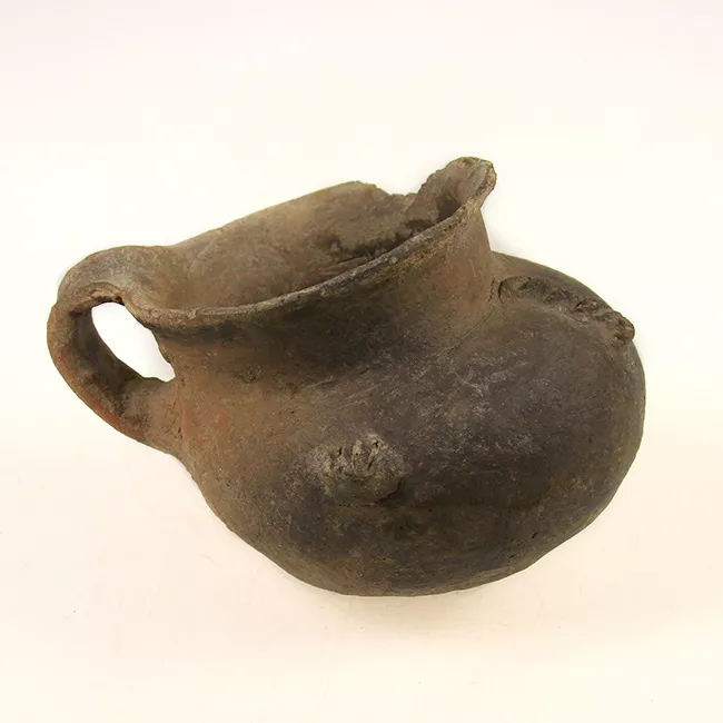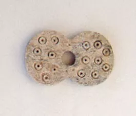 Objeto de forma alargada de cuerpo sinuoso, posee ambos extremos aguzados y muescas de inserción. Color beige con manchas marrón claro, superficie pulida.
