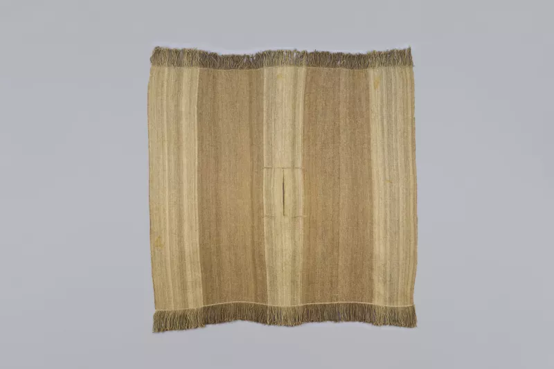 Objeto que representa un rostro de rasgos esquematizados con tocado sobre la cabeza. Tiene surcos para la definición de ojos y boca. Presenta cuello con bordes irregulares y reverso sin terminaciones. Es de color marrón.
