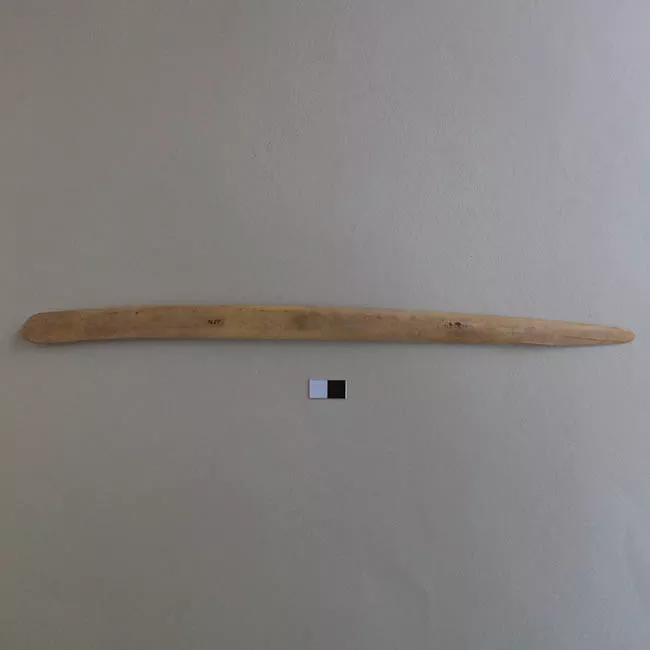 Proyectil para defensa o caza elaborado en madera de bambú. En el extremo proximal tiene terminación irregular y en el extremo distal presenta una punta de madera de chonta inserta con embarrilado de fibra vegetal. Sobre el embarrilado se observa una pasta orgánica de color negro.