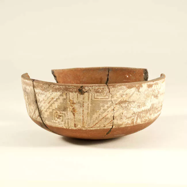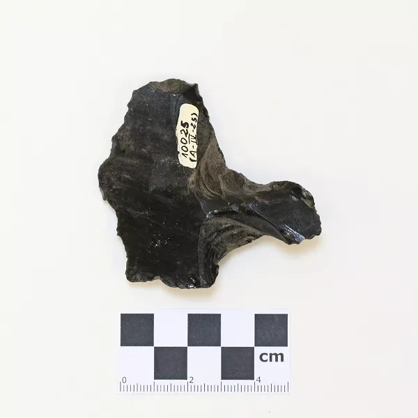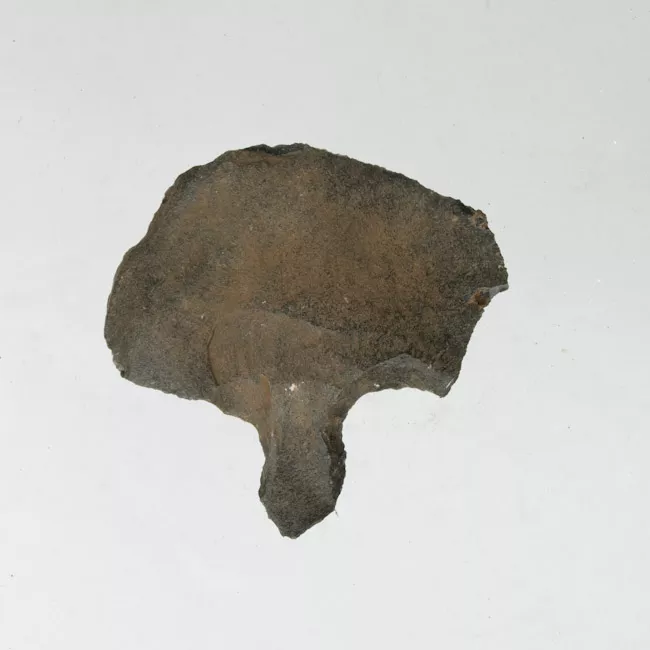 Objeto en forma de T, el brazo horizontal es semilunar mientras que el brazo vertical es triangular y apuntada. Color marrón con manchas de óxido verde.