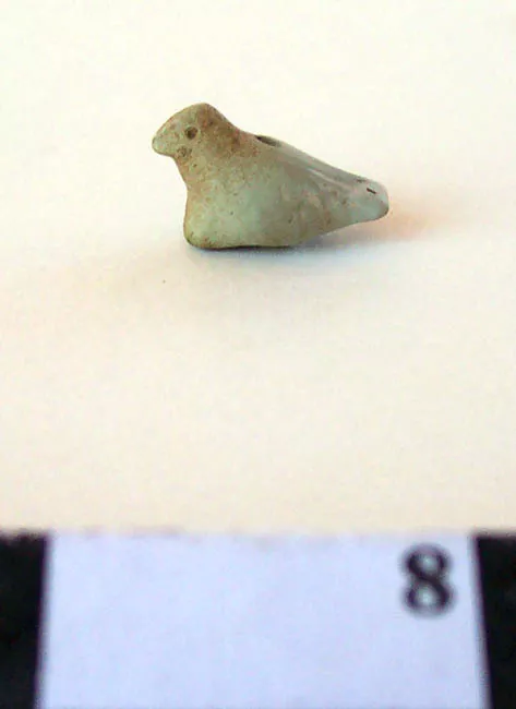 Objeto de forma troncocónica con una pequeña argolla en la parte superior. Supone una figura antropomorfa estilizada con túnica. Color marrón con óxido verde.